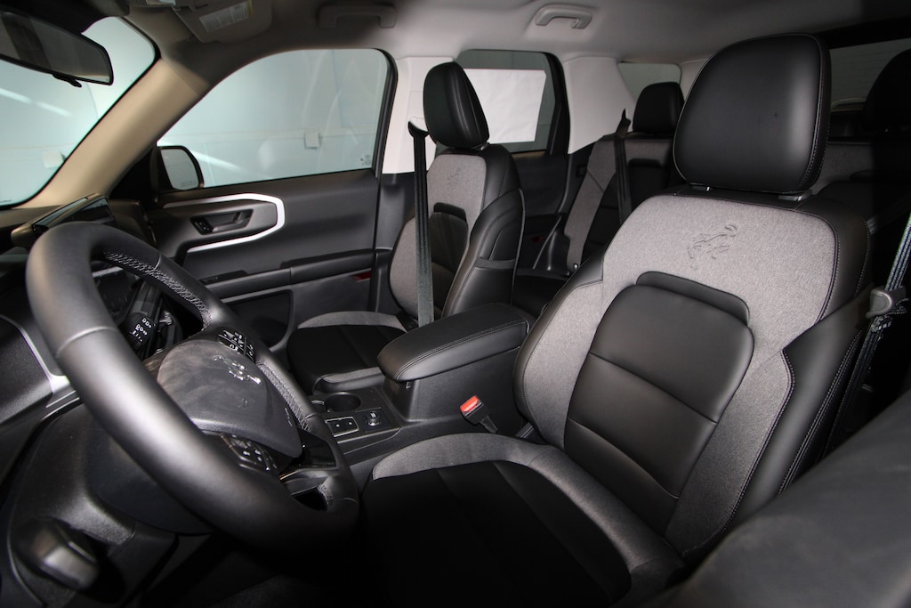 4-Wheel Disc Brakes, 6 Speakers, ABS brakes, Air Conditioning, Alloy wheels, AM/FM radio: SiriusXM, AM/FM Stereo, Auto High-beam Headlights, Automatic temperature control, Black Appearance Package, Brake assist, Carbon Black Grille w/Black BRONCO Lettering, Cargo Mat, Cloth w/Easy-to-Clean Front Bucket Seats, Compass, Convenience Package, Delay-off headlights, Driver door bin, Driver vanity mirror, Dual front impact airbags, Dual front side impact airbags, Electronic Stability Control, Emergency communication system: SYNC 4 911 Assist, Equipment Group 200A, Four wheel independent suspension, Front & Rear Floor Liners w/o Carpet Mats, Front anti-roll bar, Front Bucket Seats, Front Center Armrest, Front Driver/Passenger Seat Back Map Pockets, Front reading lights, Fully automatic headlights, Heated 8-Way Power Driver's Seat, Heated door mirrors, Illuminated entry, Knee airbag, LED Fog Lamps, Liftgate w/Black BRONCO SPORT Lettering, Low tire pressure warning, Occupant sensing airbag, Outside temperature display, Overhead airbag, Overhead console, Painted Shadow Black Roof, Panic alarm, Passenger door bin, Passenger vanity mirror, Power door mirrors, Power steering, Power windows, Premium Trimmed Htd Fr Sport Contour Bucket Seats, Premium Wrapped Steering Wheel, Radio data system, Rear anti-roll bar, Rear Parking Sensors, Rear reading lights, Rear seat center armrest, Rear window defroster, Rear window wiper, Remote keyless entry, Security system, SiriusXM, Speed control, Speed-sensing steering, Speed-Sensitive Wipers, Split folding rear seat, Steering wheel mounted audio controls, SYNC 4 w/Enhanced Voice Recognition, Tachometer, Telescoping steering wheel, Tilt steering wheel, Traction control, Trip computer, Universal Garage Door Opener (UGDO), Variably intermittent wipers, Wheels: 17" Carbonized Gray-Painted Aluminum, Wheels: 17" Matte Black-Painted Aluminum.