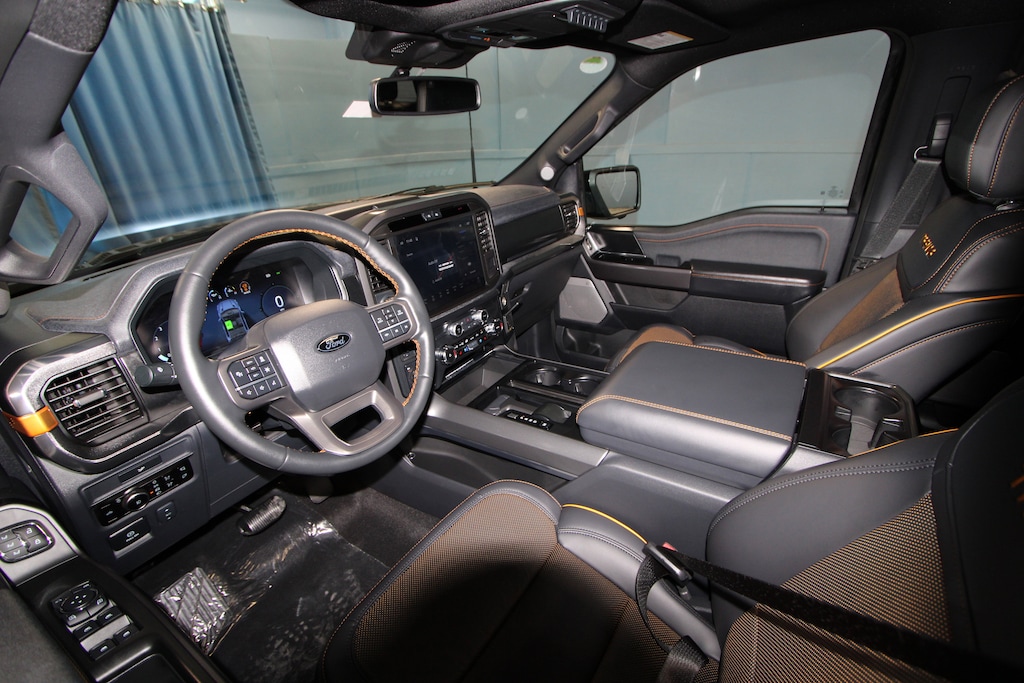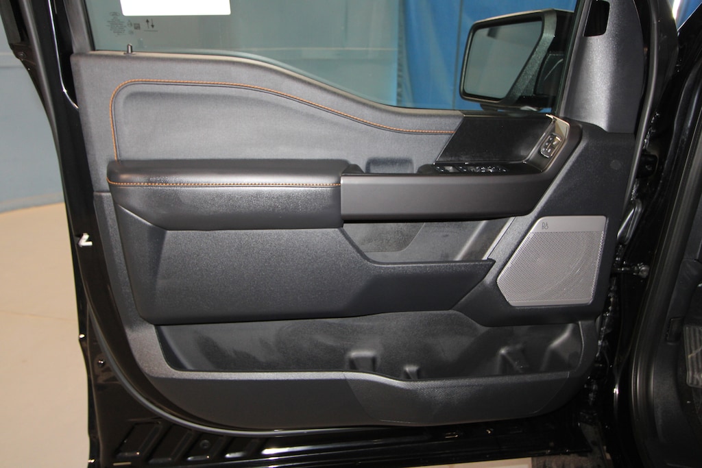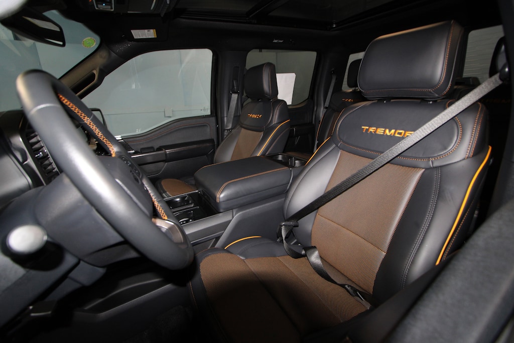 4WD, 4-Wheel Disc Brakes, 8 Speakers, ABS brakes, Adjustable pedals, Air Conditioning, Alloy wheels, AM/FM radio: SiriusXM with 360L, Auto High-beam Headlights, Auto-Dimming Rear-View Mirror, Auto-dimming Rear-View mirror, Automatic temperature control, Brake assist, Bumpers: body-color, Compass, Delay-off headlights, Driver door bin, Driver vanity mirror, Dual front impact airbags, Dual front side impact airbags, Electronic Locking with 3.73 Axle Ratio, Electronic Stability Control, Emergency communication system: SYNC 4 911 Assist, Equipment Group 402B, Ford Connectivity Package (1-Year Included), Front anti-roll bar, Front Axle with Torsen Differential, Front Bucket Seats, Front Center Armrest, Front dual zone A/C, Front fog lights, Front reading lights, Front wheel independent suspension, Fully automatic headlights, GVWR: 7,050 lbs Payload Package, Heated door mirrors, Heated front seats, Heated Steering Wheel, Illuminated entry, Integrated Trailer Brake Controller, Internet access capable: 5G Modem - Ford Connectivity Package, Low tire pressure warning, Media Bin Door, Navigation system: Connected Navigation, Occupant sensing airbag, Outside temperature display, Overhead airbag, Overhead console, Panic alarm, Passenger door bin, Passenger vanity mirror, Power door mirrors, Power driver seat, Power Glass Heated Sideview Mirrors, Power passenger seat, Power steering, Power windows, Power-Adjustable Pedals with Memory, Radio data system, Radio: B&O Sound System by Bang and Olufsen, Rain-Sensing Wipers, Rear reading lights, Rear step bumper, Rear window defroster, Remote keyless entry, Security system, Speed control, Split folding rear seat, Steering wheel mounted audio controls, SYNC 4 with Enhanced Voice Recognition, Tachometer, Telescoping steering wheel, Tilt steering wheel, Tow/Haul Package, Traction control, Trip computer, Turn signal indicator mirrors, Twin Panel Moonroof, Unique Sport Cloth 40/Console/40 Power Front Seat, Unique Tremor Leather-Trimmed Seats, Universal Garage Door Opener, Variably intermittent wipers, Wheels: 18" Alloy with Dark Matte Finish, 4WD.