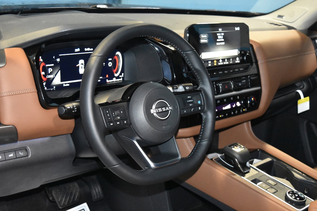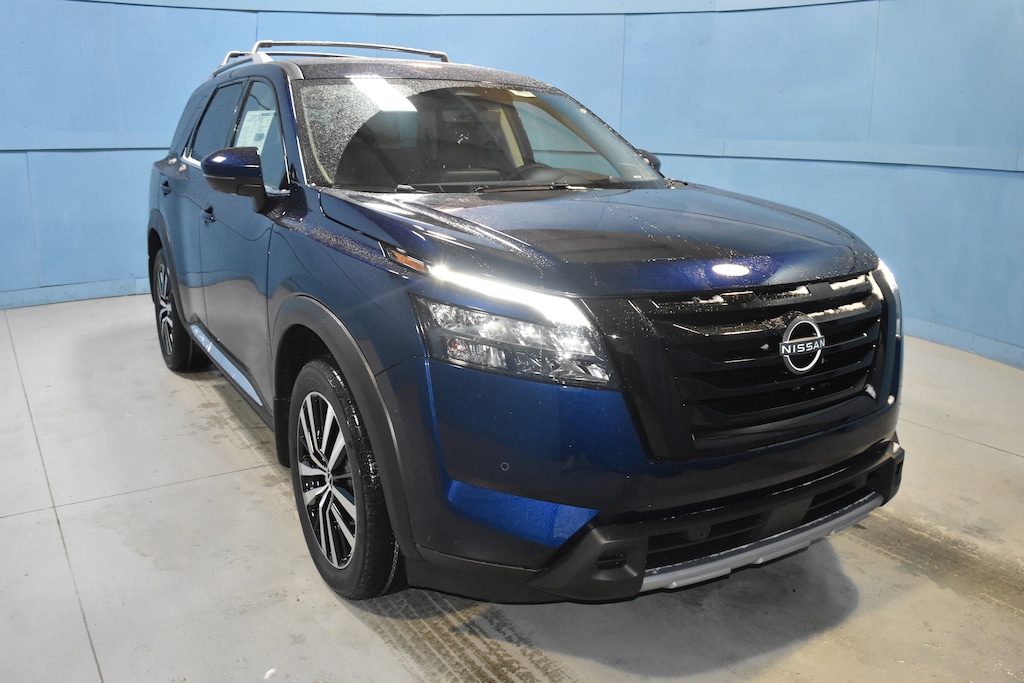 Deep Ocean Blue Pearl 2025 Nissan Pathfinder Platinum 4WD 9-Speed Automatic 3.5L V6 DOHC 4WD, 13 Speakers, 3rd row seats: bench, 4-Wheel Disc Brakes, ABS brakes, Air Conditioning, Alloy wheels, AM/FM radio: SiriusXM, Auto High-beam Headlights, Auto tilt-away steering wheel, Auto-dimming Rear-View mirror, Automatic temperature control, Bench Seat Carpeted Floor Mats (Set of 4), Black Appearance Package, Black Grille, Black Liftgate Emblems, Bodyside moldings, Bose Premium Audio System, Brake assist, Bumpers: body-color, Cargo Area Protector, Cargo Net, Cargo Package, Climate Controlled Front Bucket Seats, Cross Bars, Delay-off headlights, Driver door bin, Driver vanity mirror, Dual front impact airbags, Dual front side impact airbags, Electronic Stability Control, Emergency communication system, Exterior Parking Camera Rear, First Aid, Four wheel independent suspension, Front anti-roll bar, Front Bucket Seats, Front Center Armrest, Front dual zone A/C, Front reading lights, Fully automatic headlights, Garage door transmitter: HomeLink, Heads-Up Display, Heated door mirrors, Heated front seats, Heated rear seats, Heated steering wheel, Illuminated entry, Knee airbag, Leather steering wheel, Low tire pressure warning, Memory seat, Navigation system: NissanConnect with Navigation and Services, Nissan USB Charging Cable Set, NissanConnect featuring Apple CarPlay and Android Auto, NissanConnect w/Navigation & Services, Occupant sensing airbag, Outside temperature display, Overhead airbag, Overhead console, Panic alarm, Passenger door bin, Passenger vanity mirror, Power door mirrors, Power driver seat, Power Liftgate, Power moonroof, Power passenger seat, Power steering, Power windows, Radio data system, Radio: AM/FM Audio System, Rain sensing wipers, Rear air conditioning, Rear anti-roll bar, Rear reading lights, Rear seat center armrest, Rear side impact airbag, Rear window defroster, Rear window wiper, Reclining 3rd row seat, Remote keyless entry, Security system, Semi-Aniline Leather-Appointed Seating Surfaces, Speed control, Speed-sensing steering, Speed-Sensitive Wipers, Split folding rear seat, Spoiler, Steering wheel memory, Steering wheel mounted audio controls, Tachometer, Telescoping steering wheel, Tilt steering wheel, Traction control, Trip computer, Turn signal indicator mirrors, Variably intermittent wipers, Ventilated front seats, Wheels: 20 x 8J Machined Alloy, 4WD.