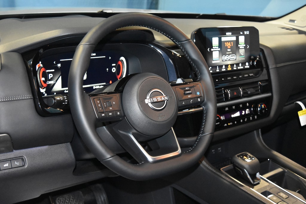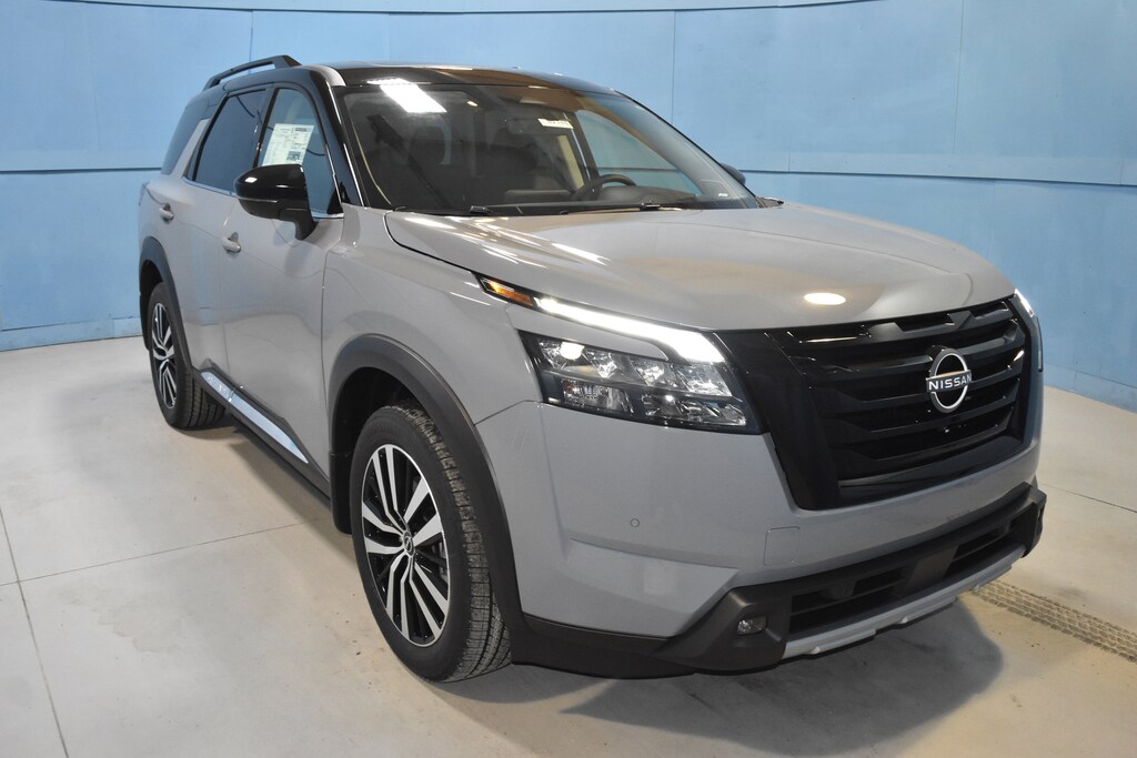 Solid Gray/Super Black 2025 Nissan Pathfinder Platinum 4WD 9-Speed Automatic 3.5L V6 DOHC 4WD, 13 Speakers, 3rd row seats: bench, 4-Wheel Disc Brakes, ABS brakes, Air Conditioning, Alloy wheels, AM/FM radio: SiriusXM, Auto High-beam Headlights, Auto tilt-away steering wheel, Auto-dimming Rear-View mirror, Automatic temperature control, Bodyside moldings, Bose Premium Audio System, Brake assist, Bumpers: body-color, Climate Controlled Front Bucket Seats, Delay-off headlights, Driver door bin, Driver vanity mirror, Dual front impact airbags, Dual front side impact airbags, Electronic Stability Control, Emergency communication system, Exterior Parking Camera Rear, Four wheel independent suspension, Front anti-roll bar, Front Bucket Seats, Front Center Armrest, Front dual zone A/C, Front reading lights, Fully automatic headlights, Garage door transmitter: HomeLink, Heads-Up Display, Heated door mirrors, Heated front seats, Heated rear seats, Heated steering wheel, Illuminated entry, Knee airbag, Leather steering wheel, Low tire pressure warning, Memory seat, Navigation system: NissanConnect with Navigation and Services, NissanConnect featuring Apple CarPlay and Android Auto, NissanConnect with Navigation and Services, Occupant sensing airbag, Outside temperature display, Overhead airbag, Overhead console, Panic alarm, Passenger door bin, Passenger vanity mirror, Power door mirrors, Power driver seat, Power Liftgate, Power moonroof, Power passenger seat, Power steering, Power windows, Radio data system, Radio: AM/FM Audio System, Rain sensing wipers, Rear air conditioning, Rear anti-roll bar, Rear reading lights, Rear seat center armrest, Rear side impact airbag, Rear window defroster, Rear window wiper, Reclining 3rd row seat, Remote keyless entry, Security system, Semi-Aniline Leather-Appointed Seating Surfaces, Speed control, Speed-sensing steering, Speed-Sensitive Wipers, Split folding rear seat, Spoiler, Steering wheel memory, Steering wheel mounted audio controls, Tachometer, Telescoping steering wheel, Tilt steering wheel, Traction control, Trip computer, Turn signal indicator mirrors, Variably intermittent wipers, Ventilated front seats, Wheels: 20 x 8J Machined Alloy, 4WD.