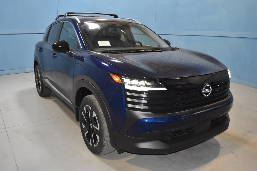 Deep Blue Pearl 2026 Nissan Kicks SV AWD CVT with Xtronic 2.0L DOHC 17 Alloy Wheels, 4 Speakers, 4-Wheel Disc Brakes, ABS brakes, Air Conditioning, Alloy wheels, AM/FM radio, Auto High-beam Headlights, Automatic temperature control, Blind Spot Warning, Brake assist, Bumpers: body-color, Carpeted Floor Mats, Cloth Seat Trim, Cold Weather Package, Crossbars, Driver door bin, Driver vanity mirror, Dual front impact airbags, Dual front side impact airbags, Electronic Stability Control, Emergency communication system, Exterior Parking Camera Rear, Four wheel independent suspension, Front anti-roll bar, Front Bucket Seats, Front Center Armrest, Front reading lights, Fully automatic headlights, Heated Front Seats, Heated Mirrors, Illuminated entry, Knee airbag, Low tire pressure warning, NissanConnect featuring Apple CarPlay and Android Auto, Occupant sensing airbag, Outside temperature display, Overhead airbag, Panic alarm, Passenger door bin, Passenger vanity mirror, Power door mirrors, Power steering, Power windows, Radio data system, Radio: AM/FM/SiriusXM Audio System, Rear anti-roll bar, Rear Floor Heater Ducts, Rear reading lights, Rear side impact airbag, Rear window defroster, Rear window wiper, Remote keyless entry, Security system, Speed control, Speed-sensing steering, Splash Guards, Split folding rear seat, Spoiler, Sport steering wheel, Steering wheel mounted audio controls, Tachometer, Telescoping steering wheel, Tilt steering wheel, Traction control, Trip computer, Variably intermittent wipers.
