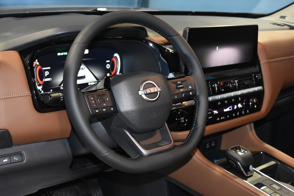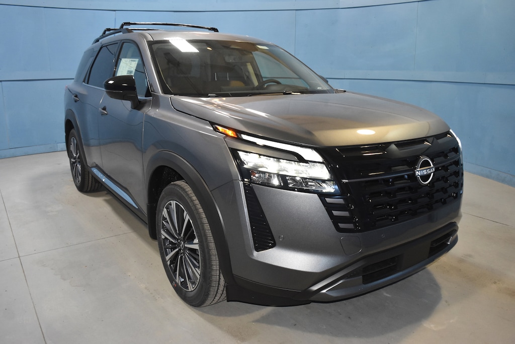 Gun Metallic 2026 Nissan Pathfinder Platinum 4WD 9-Speed Automatic 3.5L V6 DOHC 4WD, 13 Speakers, 3rd row seats: bench, 4-Piece Black Splash Guards, 4-Wheel Disc Brakes, ABS brakes, Air Conditioning, Alloy wheels, AM/FM radio: SiriusXM w/360L, Auto High-beam Headlights, Auto tilt-away steering wheel, Auto-dimming Rear-View mirror, Automatic temperature control, Bench Seat Carpeted Floor Mats, Bodyside moldings, Bose Premium Audio System, Brake assist, Bumpers: body-color, Cargo Area Protector, Cargo Net, Cargo Package, Climate Controlled Front Bucket Seats, Cross Bars, Delay-off headlights, Driver door bin, Driver vanity mirror, Dual front impact airbags, Dual front side impact airbags, Electronic Stability Control, Emergency communication system: NissanConnect Services, First Aid, Four wheel independent suspension, Front anti-roll bar, Front Bucket Seats, Front Center Armrest, Front dual zone A/C, Front reading lights, Fully automatic headlights, Garage door transmitter: HomeLink, Heads-Up Display, Heated door mirrors, Heated front seats, Heated rear seats, Heated steering wheel, Illuminated entry, Knee airbag, Low tire pressure warning, Memory seat, Navigation system: NissanConnect with Navigation and Services, NissanConnect featuring Apple CarPlay and Android Auto, Occupant sensing airbag, Outside temperature display, Overhead airbag, Overhead console, Panic alarm, Passenger door bin, Passenger vanity mirror, Power door mirrors, Power driver seat, Power Liftgate, Power moonroof, Power passenger seat, Power steering, Power windows, Radio data system, Radio: AM/FM Audio System with NissanConnect, Rain sensing wipers, Rear air conditioning, Rear anti-roll bar, Rear reading lights, Rear seat center armrest, Rear side impact airbag, Rear window defroster, Rear window wiper, Reclining 3rd row seat, Remote keyless entry, Security system, Semi-Aniline Leather-Appointed Seating Surfaces, Speed control, Speed-sensing steering, Speed-Sensitive Wipers, Split folding rear seat, Spoiler, Steering wheel memory, Steering wheel mounted audio controls, Tachometer, Telescoping steering wheel, Tilt steering wheel, Traction control, Trip computer, Turn signal indicator mirrors, Variably intermittent wipers, Ventilated front seats, Wheels: 20 Machined Alloy, 4WD.