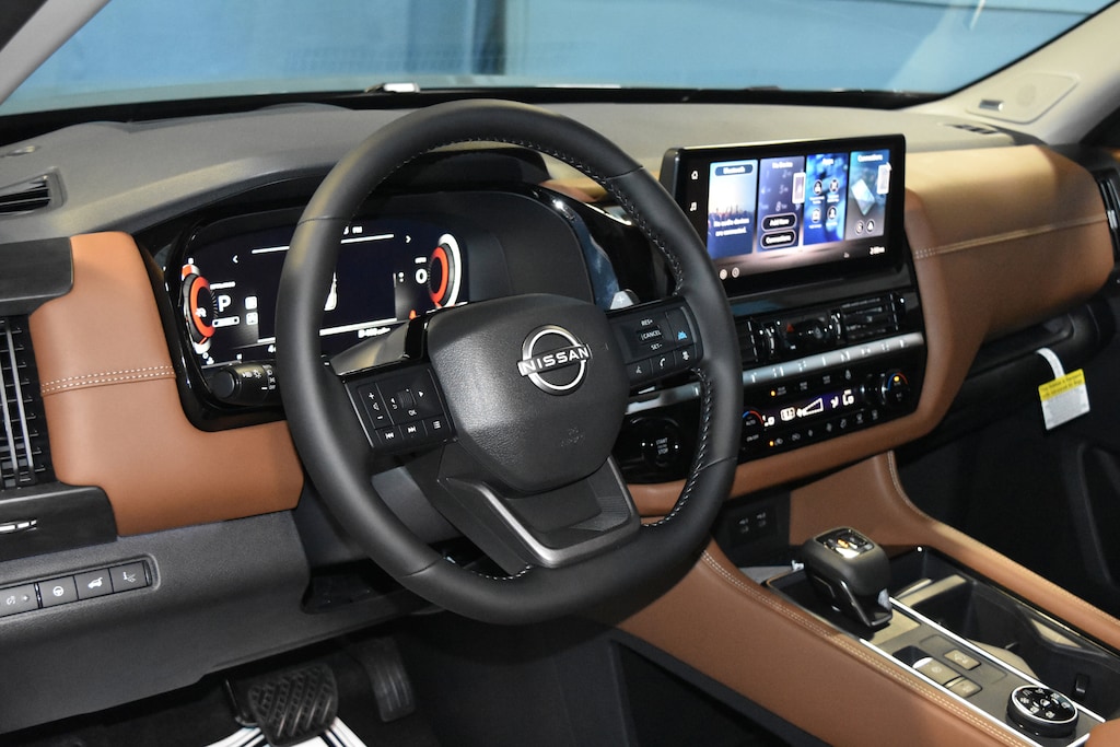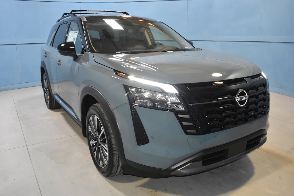 Baltic Teal/Super Black 2026 Nissan Pathfinder Platinum 4WD 9-Speed Automatic 3.5L V6 DOHC 4WD, 13 Speakers, 3rd row seats: bench, 4-Piece Black Splash Guards, 4-Wheel Disc Brakes, ABS brakes, Air Conditioning, Alloy wheels, AM/FM radio: SiriusXM w/360L, Auto High-beam Headlights, Auto tilt-away steering wheel, Auto-dimming Rear-View mirror, Automatic temperature control, Bench Seat Carpeted Floor Mats, Bodyside moldings, Bose Premium Audio System, Brake assist, Bumpers: body-color, Cargo Area Protector, Cargo Net, Cargo Package, Climate Controlled Front Bucket Seats, Cross Bars, Delay-off headlights, Driver door bin, Driver vanity mirror, Dual front impact airbags, Dual front side impact airbags, Electronic Stability Control, Emergency communication system: NissanConnect Services, First Aid, Four wheel independent suspension, Front anti-roll bar, Front Bucket Seats, Front Center Armrest, Front dual zone A/C, Front reading lights, Fully automatic headlights, Garage door transmitter: HomeLink, Heads-Up Display, Heated door mirrors, Heated front seats, Heated rear seats, Heated steering wheel, Illuminated entry, Knee airbag, Low tire pressure warning, Memory seat, Navigation system: NissanConnect with Navigation and Services, NissanConnect featuring Apple CarPlay and Android Auto, Occupant sensing airbag, Outside temperature display, Overhead airbag, Overhead console, Panic alarm, Passenger door bin, Passenger vanity mirror, Power door mirrors, Power driver seat, Power Liftgate, Power moonroof, Power passenger seat, Power steering, Power windows, Radio data system, Radio: AM/FM Audio System with NissanConnect, Rain sensing wipers, Rear air conditioning, Rear anti-roll bar, Rear reading lights, Rear seat center armrest, Rear side impact airbag, Rear window defroster, Rear window wiper, Reclining 3rd row seat, Remote keyless entry, Security system, Semi-Aniline Leather-Appointed Seating Surfaces, Speed control, Speed-sensing steering, Speed-Sensitive Wipers, Split folding rear seat, Spoiler, Steering wheel memory, Steering wheel mounted audio controls, Tachometer, Telescoping steering wheel, Tilt steering wheel, Traction control, Trip computer, Turn signal indicator mirrors, Variably intermittent wipers, Ventilated front seats, Wheels: 20 Machined Alloy, 4WD.