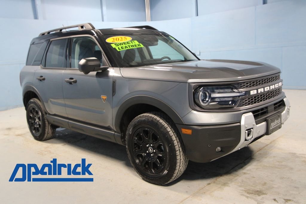 2025 Ford Bronco Sport Badlands We want you to shop confidently for your next used car at The BIG Ford Store, D-Patrick Ford. We are located on Highway 41 and Walnut in Evansville, right next to the Lloyd Expressway. Buy this used vehicle 100% online or in-store. This pre-owned vehicle was put through an extensive inspection before hitting our lot. Because of this, we are able to offer a 3-month/3,000-mile comprehensive limited warranty. You also get our Love It or Return It 5-day, 300-mile Exchange Policy. See our website for more details on both. We also offer extended service plans, vehicle protection plans, and offer a CarFax vehicle history report. *Prices listed do not include a $250 documentation fee, applicable tax, title, tags, license, or $195 service and preparation. All pricing, vehicle information, and features (such as accessories and color) are believed to be accurate, but we do not warrant or guarantee such accuracy. The prices shown above may vary from region to region, and incentives are subject to change. Some offers listed may not be available to all customers. All online sale commitments are subject to confirmation of continued availability of vehicle. Once availability is confirmed, online sale agreement becomes binding upon the parties. If any information found on the website is thought to be erroneous, please verify information with a customer service representative. See dealer for full details. Looking to sell your current vehicle? We buy cars for cash. Every test drive at D-Patrick Ford in Evansville earns $10 to a local charity. Schedule your test drive today! 4-Wheel Disc Brakes, 6 Speakers, ABS brakes, Air Conditioning, Alloy wheels, AM/FM radio: SiriusXM, AM/FM Stereo, Auto High-beam Headlights, Auto-dimming Rear-View mirror, Automatic temperature control, Brake assist, Compass, Delay-off headlights, Driver door bin, Driver vanity mirror, Dual front impact airbags, Dual front side impact airbags, Electronic Stability Control, Emergency communication system: SYNC 4 911 Assist, Equipment Group 400A, Four wheel independent suspension, Front anti-roll bar, Front Bucket Seats, Front Center Armrest, Front fog lights, Front License Plate Bracket, Front reading lights, Fully automatic headlights, Garage door transmitter, Heated door mirrors, Heated front seats, Heated steering wheel, Illuminated entry, Knee airbag, Leather Trimmed Front Bucket Seats, Low tire pressure warning, Memory seat, Occupant sensing airbag, Outside temperature display, Overhead airbag, Overhead console, Panic alarm, Passenger door bin, Passenger vanity mirror, Power door mirrors, Power driver seat, Power passenger seat, Power steering, Power windows, Radio data system, Rear anti-roll bar, Rear reading lights, Rear seat center armrest, Rear window defroster, Rear window wiper, Remote keyless entry, Security system, SiriusXM, Speed control, Speed-sensing steering, Speed-Sensitive Wipers, Split folding rear seat, Steering wheel mounted audio controls, SYNC 4 w/Enhanced Voice Recognition, Tachometer, Telescoping steering wheel, Tilt steering wheel, Traction control, Trip computer, Variably intermittent wipers, Wheels: 17" Matte Black-Painted Aluminum. CARFAX One-Owner. Clean CARFAX. 4D Sport Utility Badlands 8-Speed Automatic EcoBoost 2.0L I4 GTDi DOHC Turbocharged VCT 4WD Gray Metallic CALL TODAY (812) 625-4823 OR SHOP ONLINE AT WWW.DPATRICKFORD.COM.