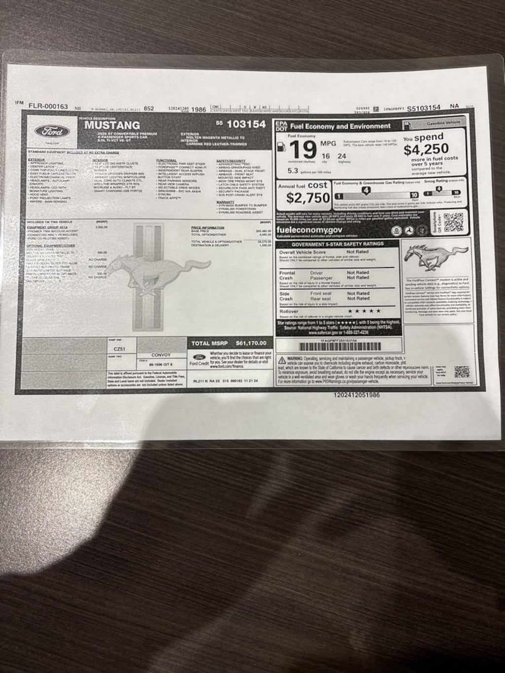 2025 Ford Mustang GT Premium Recent Arrival! We want you to shop confidently for your next used car at The BIG Ford Store, D-Patrick Ford. We are located on Highway 41 and Walnut in Evansville, right next to the Lloyd Expressway. Buy this used vehicle 100% online or in-store. This pre-owned vehicle was put through an extensive inspection before hitting our lot. Because of this, we are able to offer a 3-month/3,000-mile comprehensive limited warranty. You also get our Love It or Return It 5-day, 300-mile Exchange Policy. See our website for more details on both. We also offer extended service plans, vehicle protection plans, and offer a free to you CarFax vehicle history report. *Prices listed do not include a $250 documentation fee, applicable tax, title, tags, license, or $195 service and preparation. All pricing, vehicle information, and features (such as accessories and color) are believed to be accurate, but we do not warrant or guarantee such accuracy. The prices shown above may vary from region to region, and incentives are subject to change. Some offers listed may not be available to all customers. All online sale commitments are subject to confirmation of continued availability of vehicle. Once availability is confirmed, online sale agreement becomes binding upon the parties. If any information found on the website is thought to be erroneous, please verify information with a customer service representative. See dealer for full details. Looking to sell your current vehicle? We buy cars for cash. Every test drive at D-Patrick Ford in Evansville earns $10 to a local charity. Schedule your test drive today! 4-Wheel Disc Brakes, 9 Speakers, ABS brakes, Active Anti-Theft System, Air Conditioning, Alloy wheels, AM/FM radio: SiriusXM with 360L, AM/FM Stereo, Auto High-beam Headlights, Auto-dimming Rear-View mirror, Automatic temperature control, Brake assist, Bumpers: body-color, Climate Controlled Heated/Cooled Front Seats, Compass, Convertible roof lining, Delay-off headlights, Driver door bin, Driver Seat & Mirrors Memory, Driver vanity mirror, Dual front impact airbags, Dual front side impact airbags, Electronic Stability Control, Emergency communication system: 911 Assist, Equipment Group 401A High Package, Exterior Parking Camera Rear, Four wheel independent suspension, Front anti-roll bar, Front Bucket Seats, Front Center Armrest, Front dual zone A/C, Front reading lights, Fully automatic headlights, Garage door transmitter, Glass rear window, HD Radio, Heated door mirrors, Heated front seats, Heated steering wheel, Illuminated entry, Internet access capable: FordPass Connect, Knee airbag, Leather Shift Knob, Leather steering wheel, Leather-Trimmed Bucket Seats, Locking Center Console, Low tire pressure warning, Occupant sensing airbag, Outside temperature display, Overhead console, Panic alarm, Passenger door bin, Passenger vanity mirror, Power convertible roof, Power door mirrors, Power driver seat, Power passenger seat, Power steering, Power windows, Premium Floor Liners Front & Rear (w/Carpet Mats), Radio data system, Rain sensing wipers, Rear anti-roll bar, Rear Parking Sensors, Rear window defroster, Remote keyless entry, Security Package, Security system, SiriusXM w/360L, Speed control, Speed-sensing steering, Speed-Sensitive Wipers, Spoiler, Sport steering wheel, Steering wheel mounted audio controls, SYNC 4, Tachometer, Telescoping steering wheel, Tilt steering wheel, Traction control, Trip computer, Turn signal indicator mirrors, Variably intermittent wipers, Ventilated front seats, Voltmeter, Wheel Locking Kit, Wheels: 19" x 8.5" Shadow Silver-Painted Aluminum. CARFAX One-Owner. 2D Convertible GT Premium 10-Speed Automatic 5.0L V8 Ti-VCT RWD Magenta CALL TODAY (812) 625-4823 OR SHOP ONLINE AT WWW.DPATRICKFORD.COM.