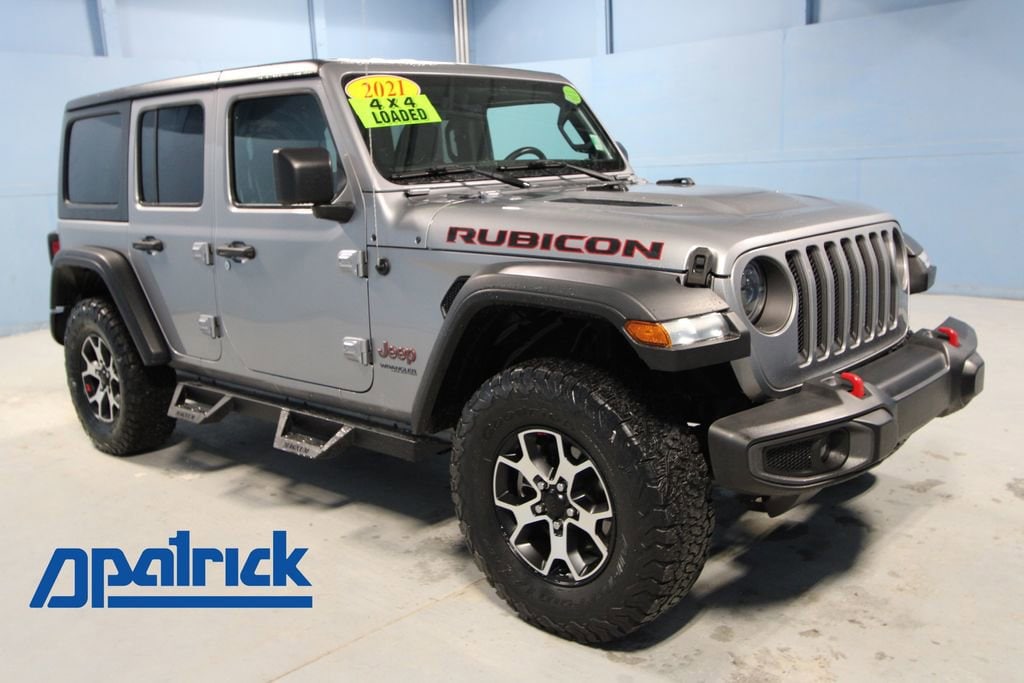 2021 Jeep Wrangler Unlimited Rubicon We want you to shop confidently for your next used car at The BIG Ford Store, D-Patrick Ford. We are located on Highway 41 and Walnut in Evansville, right next to the Lloyd Expressway. Buy this used vehicle 100% online or in-store. This pre-owned vehicle was put through an extensive inspection before hitting our lot. Because of this, we are able to offer a 3-month/3,000-mile comprehensive limited warranty. You also get our Love It or Return It 5-day, 300-mile Exchange Policy. See our website for more details on both. We also offer extended service plans, vehicle protection plans, and offer a CarFax vehicle history report. *Prices listed do not include a $250 documentation fee, applicable tax, title, tags, license, or $195 service and preparation. All pricing, vehicle information, and features (such as accessories and color) are believed to be accurate, but we do not warrant or guarantee such accuracy. The prices shown above may vary from region to region, and incentives are subject to change. Some offers listed may not be available to all customers. All online sale commitments are subject to confirmation of continued availability of vehicle. Once availability is confirmed, online sale agreement becomes binding upon the parties. If any information found on the website is thought to be erroneous, please verify information with a customer service representative. See dealer for full details. Looking to sell your current vehicle? We buy cars for cash. Every test drive at D-Patrick Ford in Evansville earns $10 to a local charity. Schedule your test drive today! 1-Year SiriusXM Guardian Trial, 4-Wheel Disc Brakes, 4.10 Rear Axle Ratio, 5-Year SiriusXM Traffic Service, 5-Year SiriusXM Travel Link Service, 8 Speakers, 8.4 Radio & Premium Audio Group, 8.4 Touchscreen Display, ABS brakes, Air Conditioning, Alloy wheels, Alpine Premium Audio System, AM/FM radio: SiriusXM, Apple CarPlay/Android Auto, Automatic temperature control, Aux Battery, Black 3-Piece Hard Top, Brake assist, Cold Weather Group, Compass, Delay-off headlights, Driver door bin, Driver vanity mirror, Dual front impact airbags, Dual front side impact airbags, Electronic Stability Control, Freedom Panel Storage Bag, Front anti-roll bar, Front Bucket Seats, Front Center Armrest w/Storage, Front dual zone A/C, Front fog lights, Front reading lights, Fully automatic headlights, Garage door transmitter, GPS Navigation, HD Radio, Heated door mirrors, Heated Front Seats, Illuminated entry, Integrated roll-over protection, Leather steering wheel, Low tire pressure warning, MOPAR All-Weather Floor Mats (DISC), Non-Lock Fuel Cap w/o Discriminator, Occupant sensing airbag, Outside temperature display, Panic alarm, ParkView Rear Back-Up Camera, Passenger door bin, Passenger vanity mirror, Performance Suspension, Power door mirrors, Power steering, Power windows, Premium Cloth Low-Back Bucket Seats, Quick Order Package 25R, Radio data system, Radio: Uconnect 4 w/7 Display, Radio: Uconnect 4C Nav w/8.4 Display, Rear anti-roll bar, Rear reading lights, Rear Window Defroster, Remote keyless entry, Remote Proximity Keyless Entry, Remote Start System, Security system, SiriusXM Travel Link, Speed control, Split folding rear seat, Steering wheel mounted audio controls, Stop-Start Dual Battery System, Tachometer, Telescoping steering wheel, Tilt steering wheel, Traction control, Trip computer, Variably intermittent wipers, Voltmeter, Wheels: 17 x 7.5 Machined w/Black Pockets. CARFAX One-Owner. Clean CARFAX. 4D Sport Utility Unlimited Rubicon 8-Speed Automatic 3.6L V6 24V VVT 4WD Billet Silver Metallic Clearcoat CALL TODAY (812) 625-4823 OR SHOP ONLINE AT WWW.DPATRICKFORD.COM.