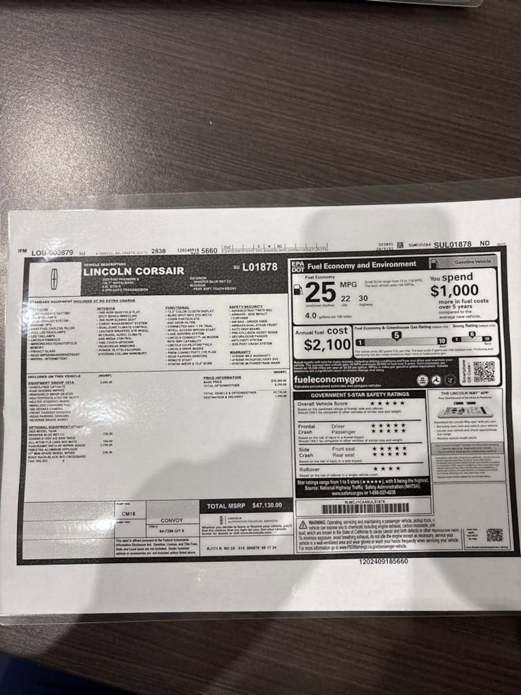 2025 Lincoln Corsair Premiere Recent Arrival! We want you to shop confidently for your next used car at The BIG Ford Store, D-Patrick Ford. We are located on Highway 41 and Walnut in Evansville, right next to the Lloyd Expressway. Buy this used vehicle 100% online or in-store. This pre-owned vehicle was put through an extensive inspection before hitting our lot. Because of this, we are able to offer a 3-month/3,000-mile comprehensive limited warranty. You also get our Love It or Return It 5-day, 300-mile Exchange Policy. See our website for more details on both. We also offer extended service plans, vehicle protection plans, and offer a free to you CarFax vehicle history report. *Prices listed do not include a $250 documentation fee, applicable tax, title, tags, license, or $195 service and preparation. All pricing, vehicle information, and features (such as accessories and color) are believed to be accurate, but we do not warrant or guarantee such accuracy. The prices shown above may vary from region to region, and incentives are subject to change. Some offers listed may not be available to all customers. All online sale commitments are subject to confirmation of continued availability of vehicle. Once availability is confirmed, online sale agreement becomes binding upon the parties. If any information found on the website is thought to be erroneous, please verify information with a customer service representative. See dealer for full details. Looking to sell your current vehicle? We buy cars for cash. Every test drive at D-Patrick Ford in Evansville earns $10 to a local charity. Schedule your test drive today! 18" Bright Machined Aluminum Wheels, 2 Additional USB Ports in Rear of Center Console, 360-Degree Camera, 4-Wheel Disc Brakes, 60/40 EasyFold Rear Seat w/Power Seatback Release, 9 Speakers, ABS brakes, Air Conditioning, Alexa Built-In, All-Weather Floor Liners, Alloy wheels, AM/FM radio: SiriusXM with 360L, Apple CarPlay/Android Auto, Auto High-beam Headlights, Auto-dimming Rear-View mirror, Automatic temperature control, Black Roof Rack Side Rails, Brake assist, Bumpers: body-color, Compass, Delay-off headlights, Driver door bin, Driver vanity mirror, Dual front impact airbags, Dual front side impact airbags, Electronic Stability Control, Emergency communication system: 911 Assist, Equipment Group 101A, Four wheel independent suspension, Frameless Auto Dimming Rearview Mirror, Front anti-roll bar, Front Bucket Seats, Front Center Armrest, Front dual zone A/C, Front Parking Sensors, Front reading lights, Fully automatic headlights, Hands-Free Liftgate, Heated door mirrors, Heated front seats, Heated Sideview Mirrors, Heated Steering Wheel, Heated/Ventilated Driver & Front Passenger Seats, Illuminated entry, Knee airbag, Leather steering wheel, Lincoln Soft Touch Heated Front Captain's Chairs, Low tire pressure warning, Memory seat, Micro-Perf Lincoln Soft Touch Captain's Chairs, Navigation system: Connected Navigation (4-year trial), Occupant sensing airbag, Outside temperature display, Overhead airbag, Overhead console, Panic alarm, Panoramic Vista Roof w/Power Shade, Passenger door bin, Passenger vanity mirror, Phone As A Key (PAAK), Post-Collision Braking, Power door mirrors, Power driver seat, Power Liftgate, Power passenger seat, Power steering, Power Tilt/Telescoping Steering Column w/Memory, Power windows, Radio data system, Radio: Lincoln Premium Audio System w/MP3, Rain Sensing Wipers, Rear anti-roll bar, Rear Parking Sensors, Rear reading lights, Rear seat center armrest, Rear window defroster, Rear window wiper, Remote keyless entry, Reverse Brake Assist, Security system, SiriusXM w/360L Radio, Speed control, Speed-sensing steering, Speed-Sensitive Wipers, Split folding rear seat, Spoiler, Steering wheel mounted A/C controls, Steering wheel mounted audio controls, SYNC 4 Communications & Entertainment System, Tachometer, Telescoping steering wheel, Tilt steering wheel, Traction control, Trip computer, Univer